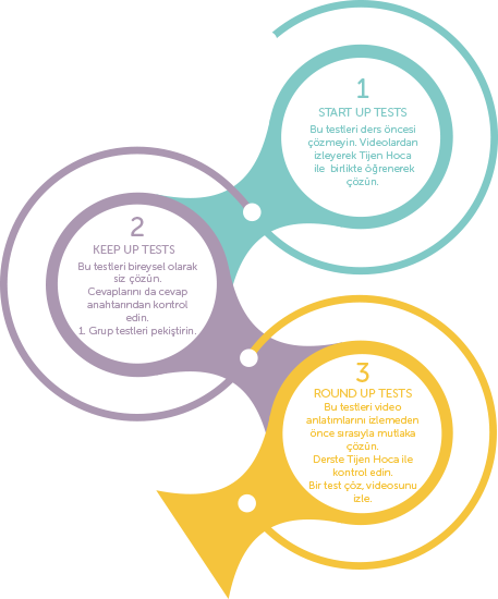 Sistem 3 bölümden oluşuyor: İlk bölüm START UP testlerinden meydana geliyor. Tüm testlerde sarmal bir döngü kurgulanmış durumda. 2500’ü aşkın test sorusu ile eşanlama dayanan çalışmalar benimle birlikte yapılıyor. Yani siz öğrencilerin önceden çözerek video dersi izlemesine gerek yok. İkinci bölümde ise KEEP UP testleri mevcut. Burada ise 1400’den fazla soru ile önceki bölümdeki kelime kategorileri bu kez öğrenciler tarafından çözülüyor ve sonra cevap anahtarı ile kontrol ediliyor. Pekiştirmeler de yapıldıktan sonra bu kelimeleri toparlamak için eşleştirme testlerinin olduğu 3. Bölüme geçiliyor. 3. Bölüm ROUND UP Testlerini içeriyor. Eşanlamlı ya da yakın anlamlı kelimeleri eşleştirdiğiniz 85 test ile 6800’den fazla kelime eşleştiriliyor. Bu bölümün testleri de yine önce öğrenci tarafından bireysel olarak çözülüyor. Ardından da benimle birlikte videolar izlenerek kontrol edilerek çalışmalar tamamlanıyor. Böylece oldukça fazla sayıda kelime biliyorsunuz çünkü hepsi ile ilgili bir anınız oluyor, ve çünkü her kelimeye çok keresistematik olarak maruz kalıyorsunuz. Yaşayan bir kelime belleğine sahip olmanızı sağlayan çok sağlam bir sistem. Temennimiz çok sayıda kişinin bu sayede artık yılardır devam eden kelime sorununu çözmesi.